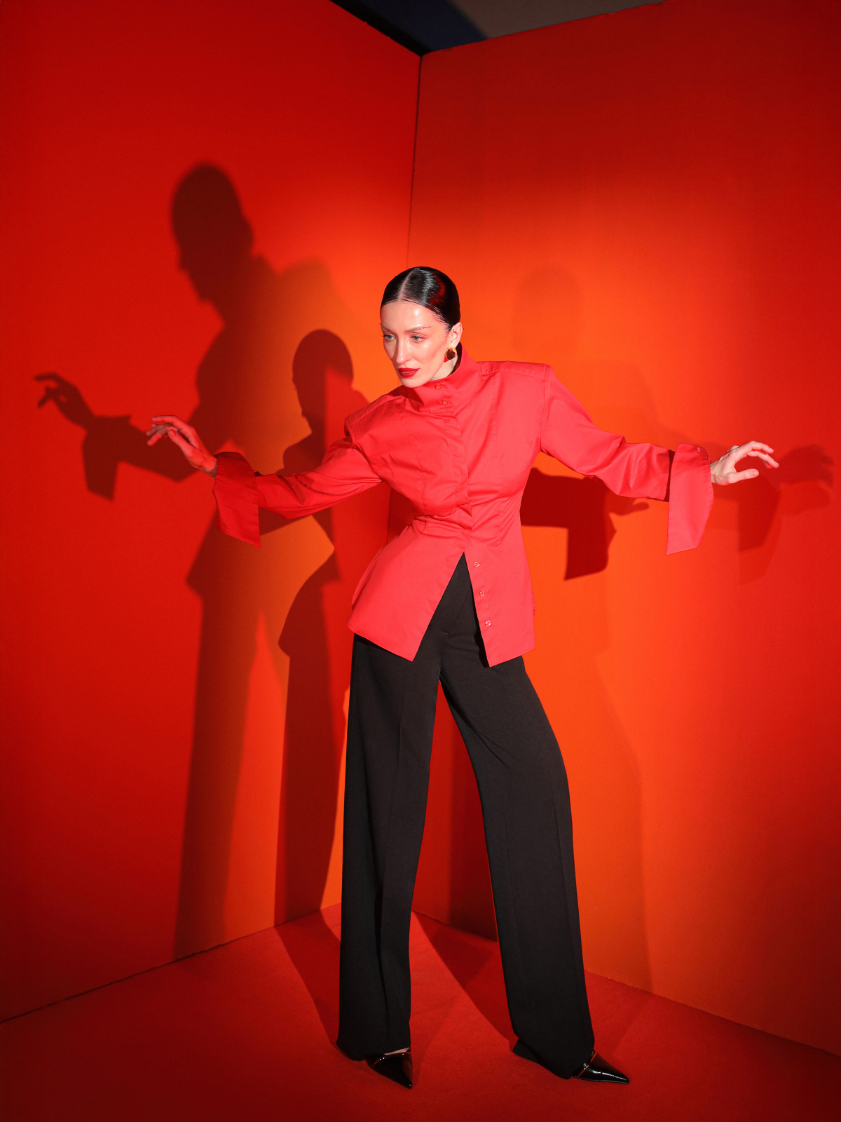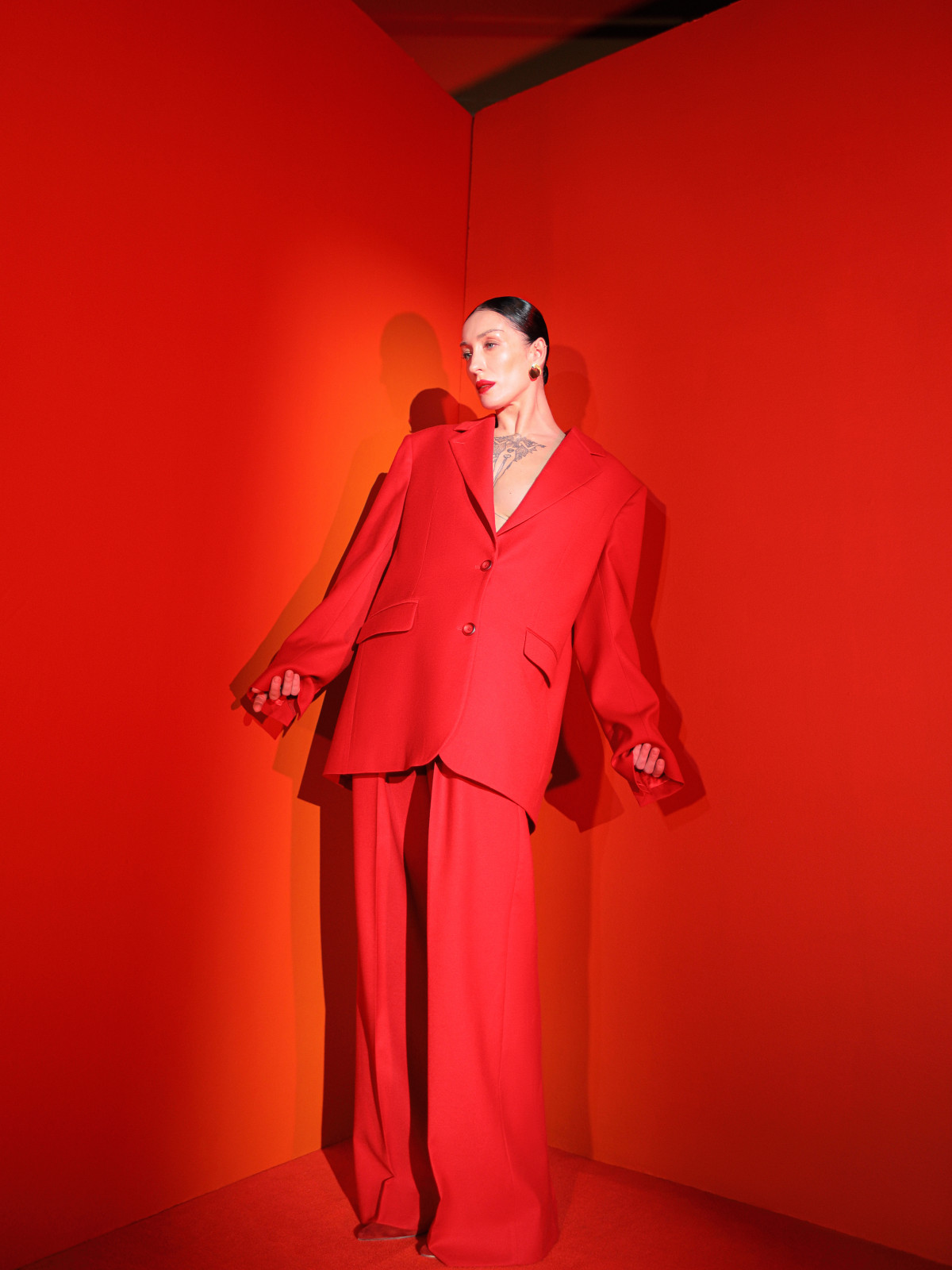 Уже знакові для L’ESKIZZO чіткі лінії та виважені акценти формують пропорції силуетів, що дарують свободу рухів і підкреслюють внутрішню зібраність. Червоний, ключовий колір колекції, звучить не як виклик, а як м’яка сила, що відкриває простір для самовираження.
