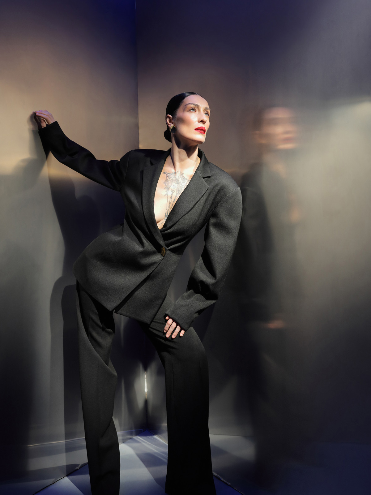 У межах Midnight Ember L’ESKIZZO співпрацював з ювелірним брендом rimmart. Латунний ґудзик і акцентні срібні сережки — це прикраси про жіночу силу, що проявляється в деталях і повазі до матеріалу. Оздоби формують з одягом єдину пластику, створюючи відчуття завершеності.