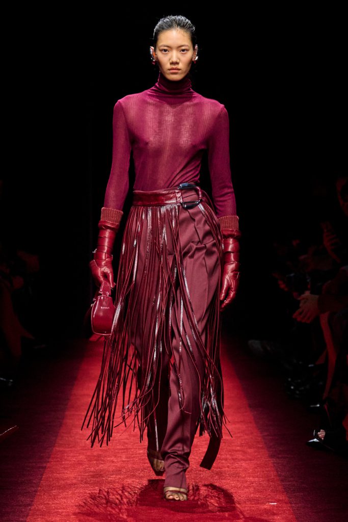 Поряд із ними на подіумах з’явилися й зовсім інші за настроєм моделі — шкіряні спідниці з бахромою. Вони звучать стриманіше, але не менш переконливо: щільний матеріал додає образам чіткості й структури, а рухлива деталь пом’якшує силует. Саме такі варіанти стають універсальним рішенням для зимового гардероба, легко переходячи зі святкових виходів у повсякденні стилізації.