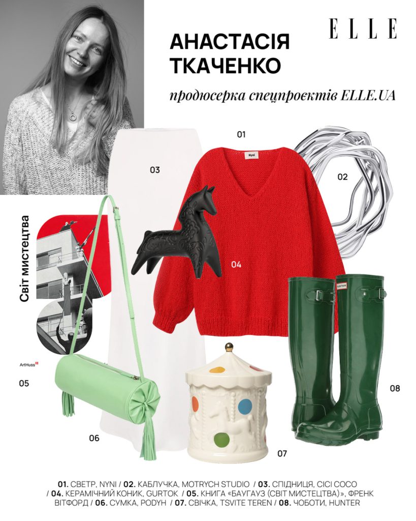 Як результат, в мене гармонійно склався комплект зі спідниці Cici Coco, светру ручного в’язанння Nyni та лоскових чобіт Hunter. За грайливість відповідає сумка Podyh. Творчого самовираження додає каблучка Motrych Studio. В цьому образі запалюємо свічку Tsvite Teren з колекціїї ho-ho та всідаємося читати книгу «Баугаус (Світ Мистецтва)». Ну і поринаємо в новорічний настрій у стилі «арт»!