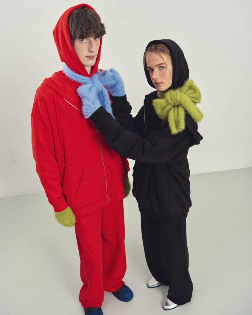Серед акцентних святкових моделей: прозорий лонгслів, шорти в паєтку у двох довжинах, об’ємне боа з пір’я. Поруч із ними базова частина колекції: теплі флісові зіп-кофти, оновлені худі та штани у чорному та брендовому червоному кольорі.