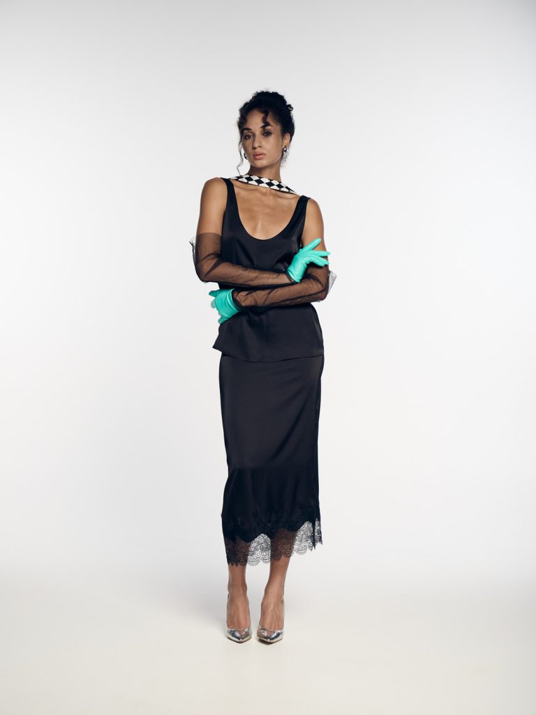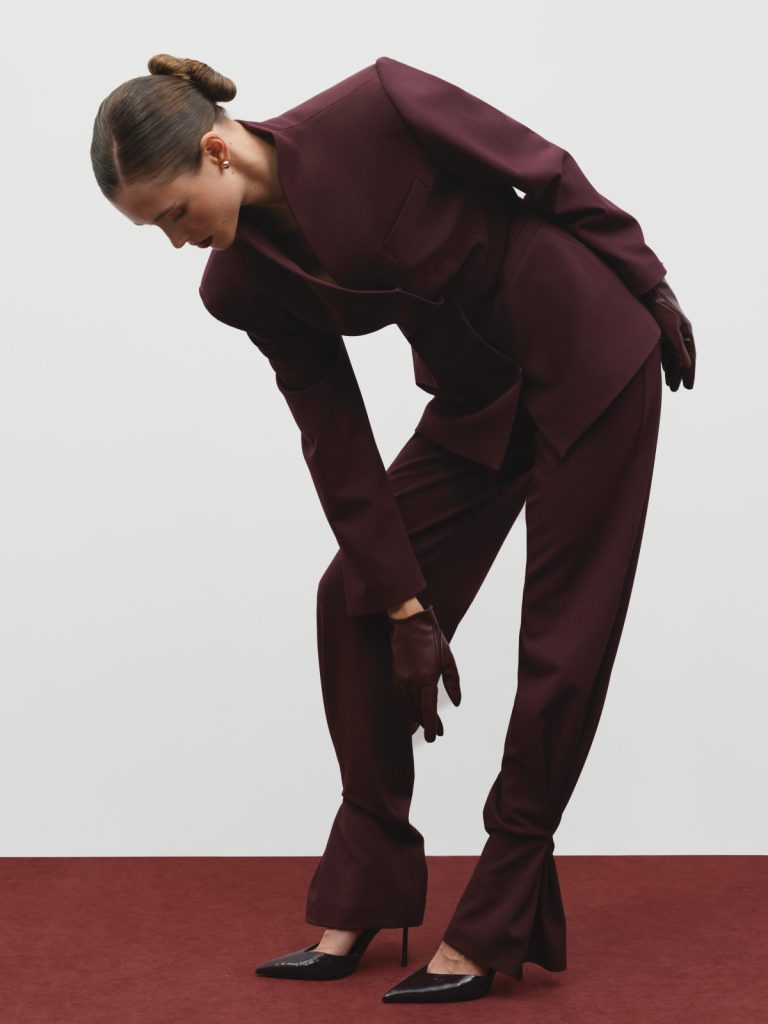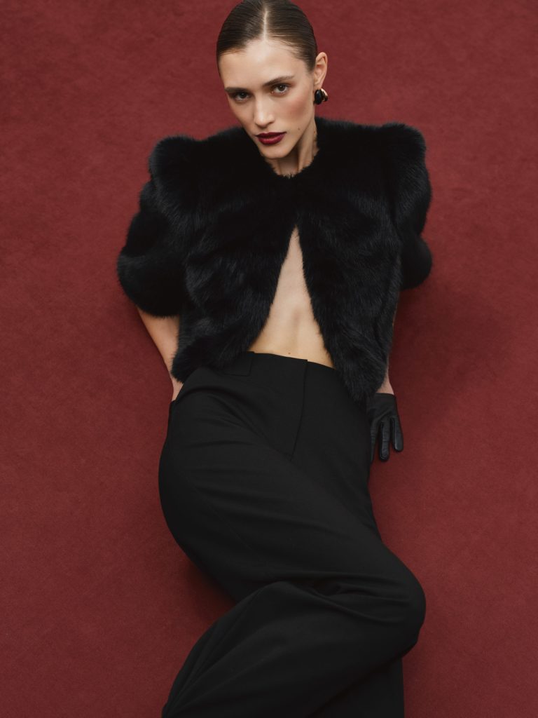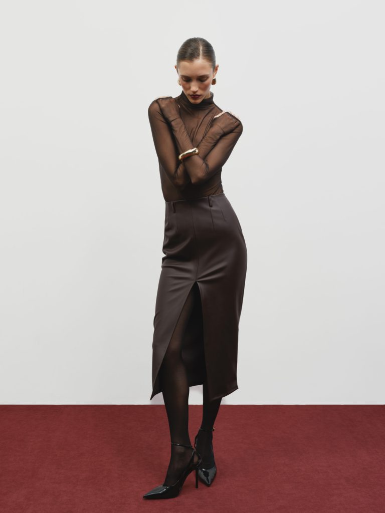 М’які трикотажні костюми з вовни ягня та віскози, делікатні поло і шуба з вираженою, проте ніжною фактурою — доповнюють будь-який повсякденний образ, надаючи йому шарму, м’якості та тепла. Водночас CHIC BASICS цілковито переосмисює базовий гардероб: напівпрозорий трикотаж, спідниці з нестандартними вирізами та екошкіра зберігають геометрію, підкреслюють лінії тіла і залишають простір для індивідуальності. Акцентом блоку стали штани зі зав’язками ж актуальна інтерпретація мінімалізму, де одна деталь формує характер образу.
