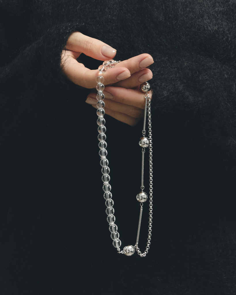Лінійку формують прикраси ручної роботи, виконані в стилі геометричного мінімалізму. Центральним елементом колекції стало асиметричне кольє — арт-об’єкт, у якому гірський кришталь ніби зависає між металевими фрагментами. Аксесуар передає ідею творчої свободи, балансу та здатності жінки рухатися поза прописаними правилами, зберігаючи власний центр.