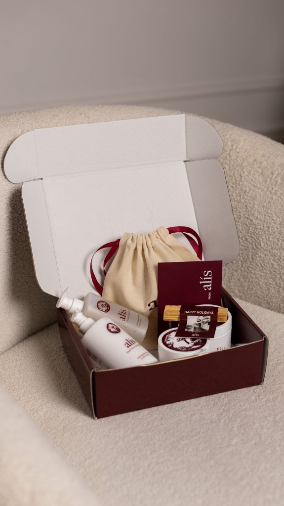 Alís Holiday Box — це не просто подарунок з доглядовою косметикою для тіла, це жест турботи та любові. Наповнення боксу обирається індивідуально з усіх доступних засобів Alís. Окрім продуктів, до набору входить ароматична паличка Пало Санто для створення особливої атмосфери спокою та ритуалу турботи. Також бренд пропонує підписати індивідуальну листівку з найщирішими побажаннями, а також додає брендовий текстильний мішечок для зручного зберігання та транспортування засобів.