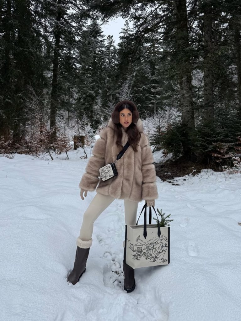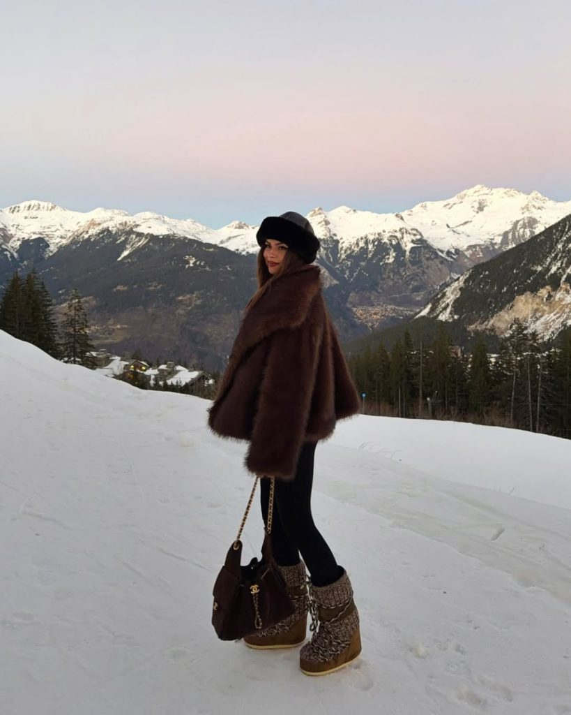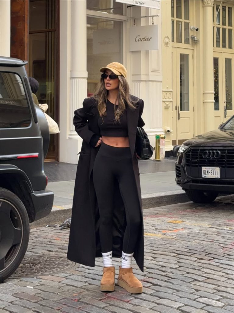 Та зимовий гардероб 2026 року не обмежується лише класикою. Поруч зі шкіряними чоботами впевнено закріплюються ugg та культові Moon Boot — м’які, зручні та максимально розслаблені моделі, які завдяки об’єму й масивності створюють своєрідний контраст з обтислими легінсами. Такі чоботи часто з’являються в аутфітах для справді холодних днів, поїздок за місто чи активних зимових виходів, де комфорт і тепло виходять на перший план.