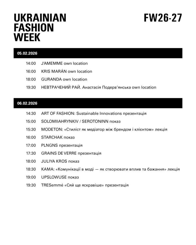 З 5 по 8 лютого 2026 року в Києві відбудеться Ukrainian Fashion Week FW26-27. Свої колекції в офіційній програмі у форматах показів, презентацій та trade show представлять 40 українських модних брендів.
